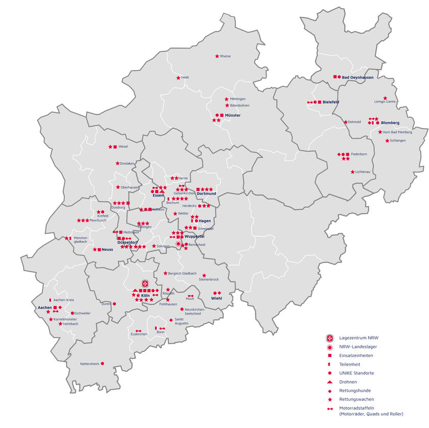 Die Johanniter-Unfall-Hilfe e.V. ist als größte christliche Hilfsorganisation in Nordrhein-Westfalen ein zentraler Leistungserbringer im Rettungsdienst (77 Rettungswachen) und Bevölkerungsschutz des Landes. Neben den insgesamt 24 Einsatzeinheiten der JUH im Land verfügt sie weiterhin über ein umfangreiches und weitreichendes Fähigkeitsprofil, das sich nicht nur in diesen entsprechenden Kernbereichen ausdrückt, sondern darüber hinaus in vielen anderen Tätigkeiten ablesen lässt. Aber auch besondere spezialisierte Fähigkeiten wie Rettungshunde, Drohneneinheiten oder Motorradstaffeln prägen das umfangreiche Kompetenzprofil der Johanniter in Nordrhein-Westfalen.