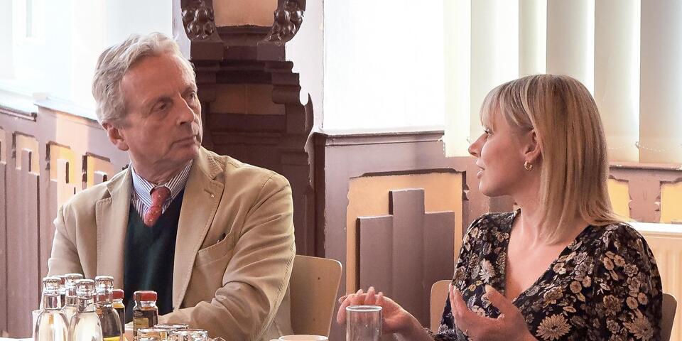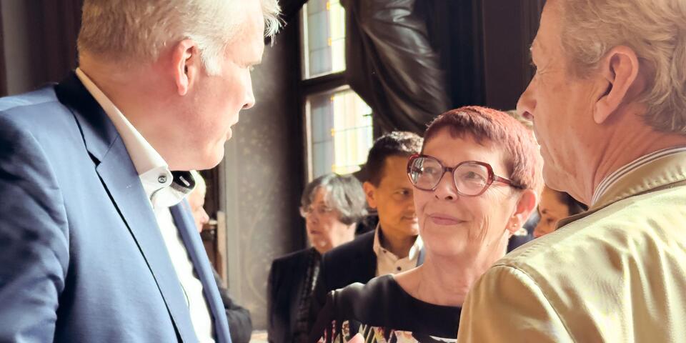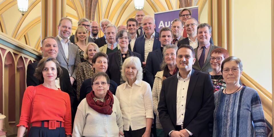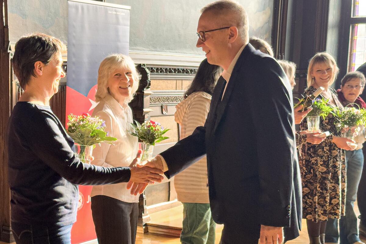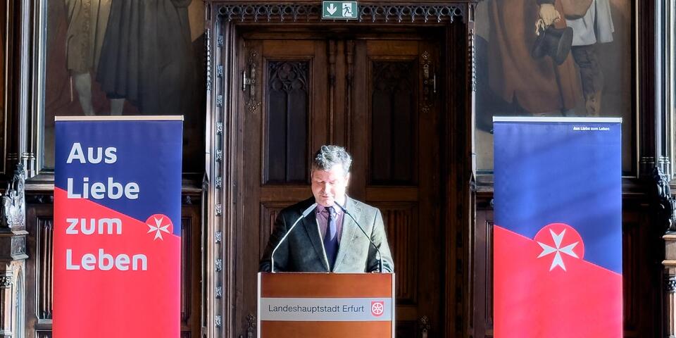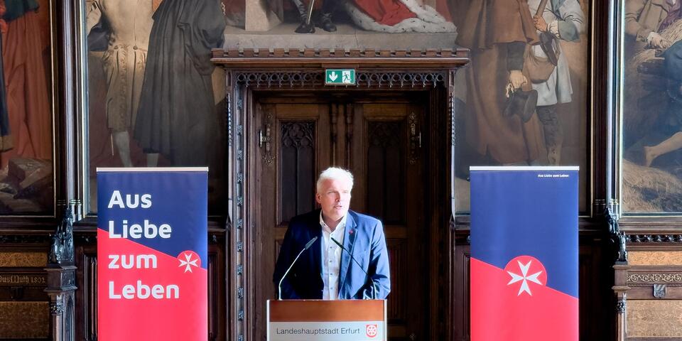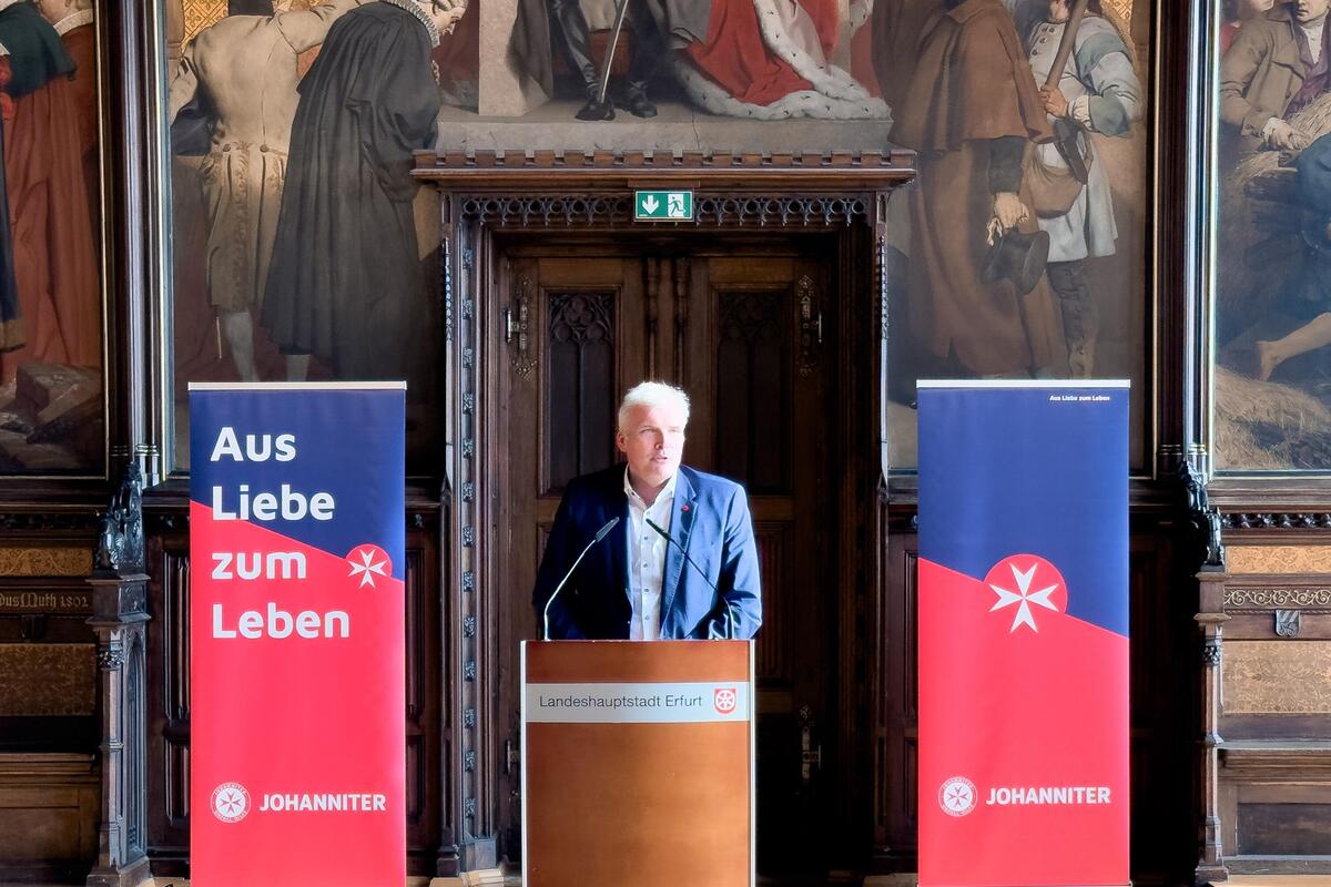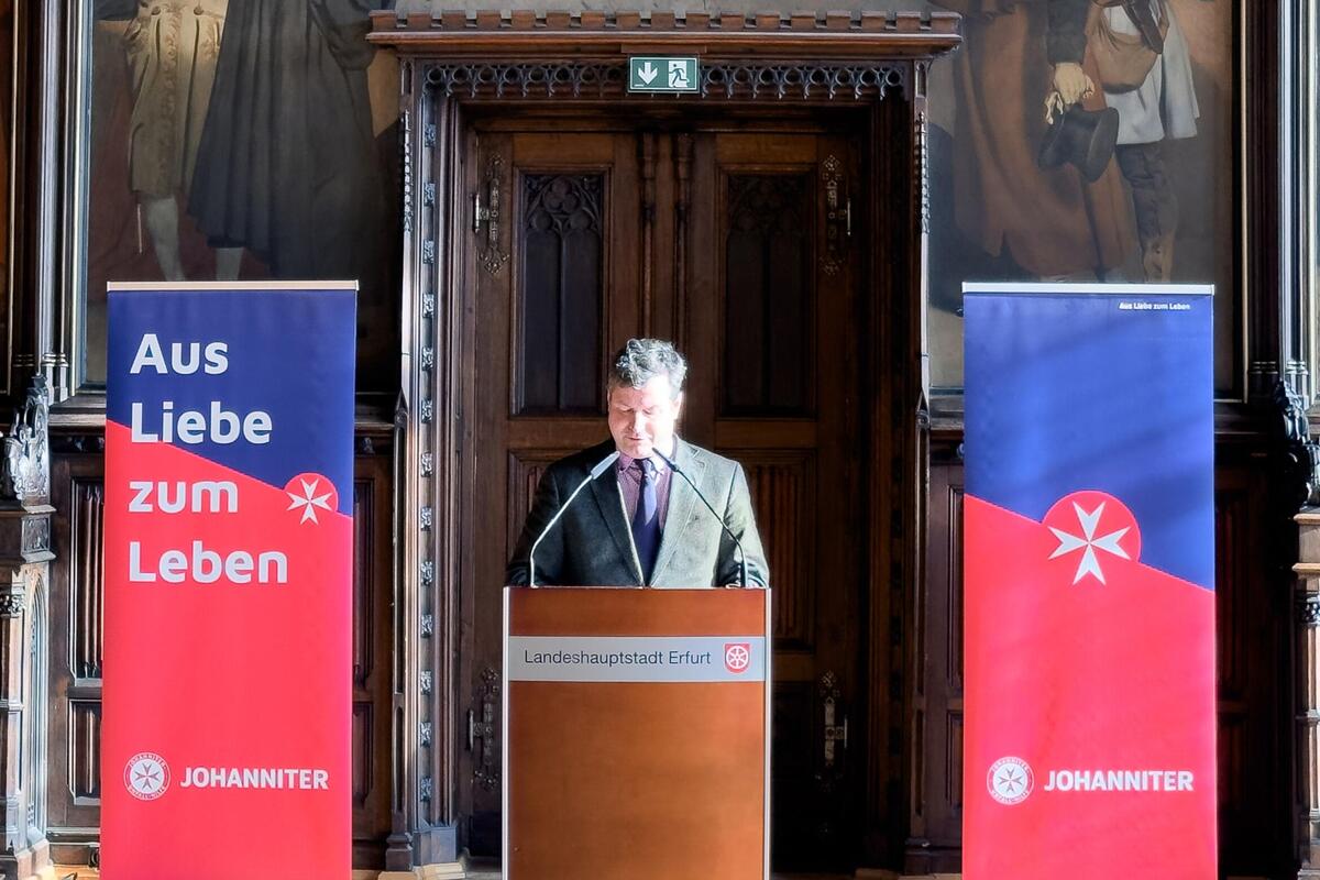 Bei seinen Stationen in der Landesgeschäftsstelle Erfurt, im Rathaus der Stadt Erfurt und in der Kita "Weltentdecker" in Arnstadt stand vor allem der Austausch mit ehrenamtlichen und hauptamtlichen Johannitern im Vordergrund. Insbesondere das Gespräch mit dem Ambulanten Trauer- und Hospizdienst Weimar-Erfurt, der Ethikberatung und der Notfallseelsorge zeigte eindrucksvoll wie vielfältig das Ehrenamt bei den Johannitern ist. Es war dem Herrenmeister Prinz von Preußen und dem ehrenamtlichen Landesvorstand Konstantin von Eichborn eine Herzensangelegenheit, den anwesenden ehrenamtlichen Kolleginnen und Kollegen Respekt und Dank für ihre wichtige Arbeit auszusprechen. Auch Andreas Bausewein, Oberbürgermeister der Stadt Erfurt, dankte den Johannitern für ihren unermüdlichen Einsatz. Als Wertschätzung lud er den Herrenmeister des Johanniterordens sowie haupt- und ehrenamtliche Johanniter zu einem Empfang im historischen Festsaal im Rathaus ein.