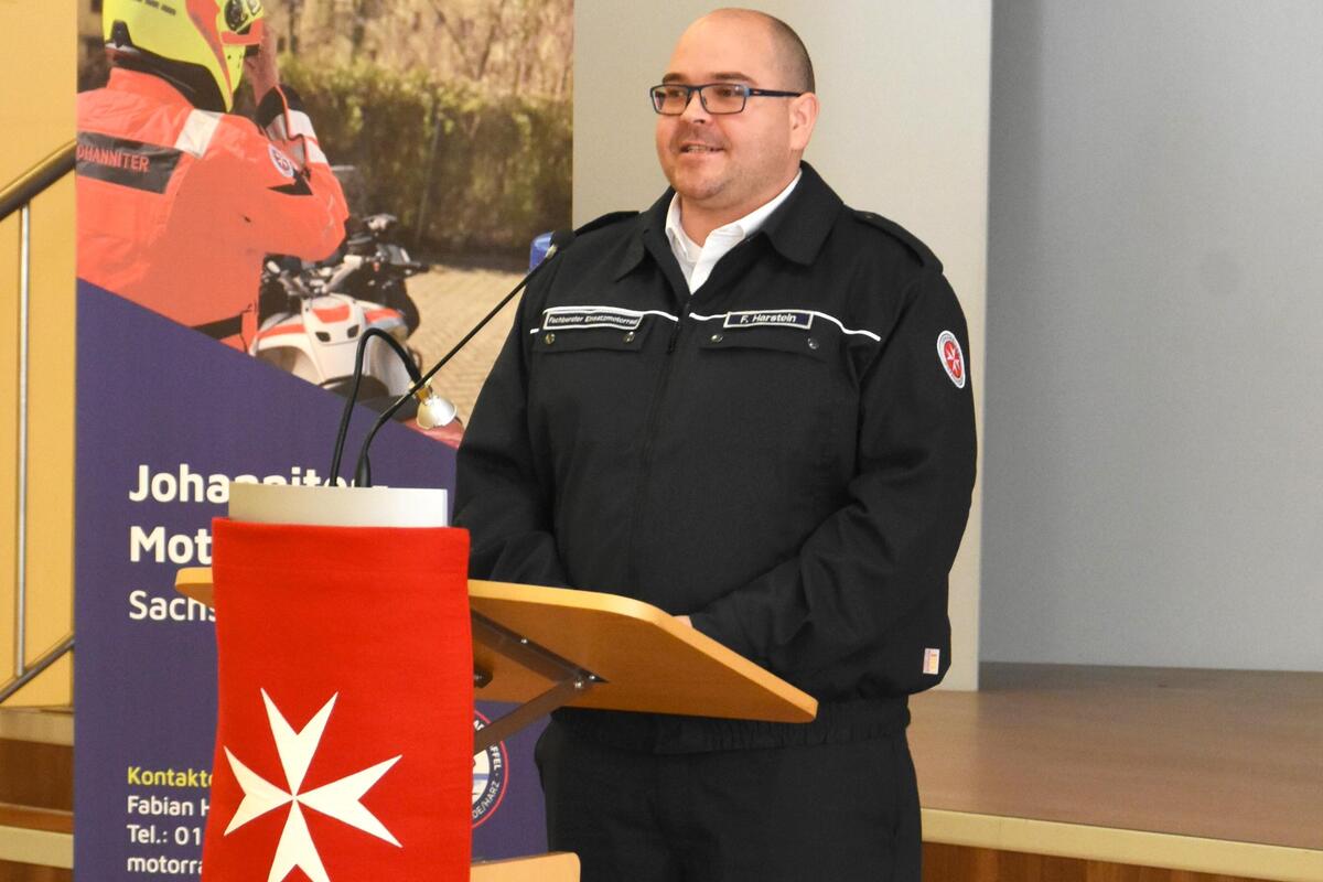 Konstantin von Eichborn hob in seiner Laudatio nicht nur die Mischung aus Haupt- und Ehrenamt hervor, sondern beschrieb Fabian Harsteln als Macher, der es geschafft habe, mit der Motorradstaffel nicht nur ein im Landesverband einzigartiges Projekt zu initiieren, sondern auch ein Team um sich zu versammeln. Die Helfer auf zwei Rädern haben seit Gründung bei unzähligen Einsätzen helfen können, wenn Rettungsdienst oder Feuerwehr nicht direkt zum Unfallort vordringen konnten - wenn z.B. keine ausreichende Rettungsgasse gebildet wurde.