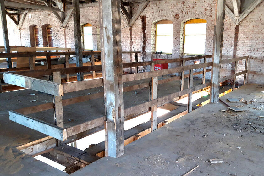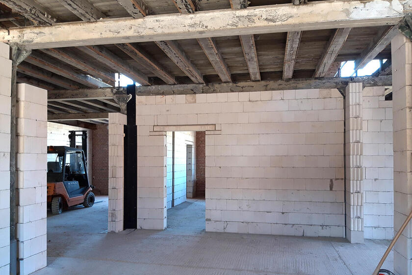 Teilweise zurückgebaut werden mussten die Stützen der Dachkonstruktion. Hilfsabstützungen für die Zeit der Maurerarbeiten im 2. Obergeschoss sind dafür errichtet worden.