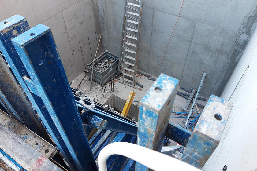 Weiterhin sind die Aussparungen in der Holzbalkendecke zur Durchführung des Mauerwerkes abgeschlossen. Im Untergeschoss wurden auf der Ostseite die Wände für das neue Treppenhaus errichtet und der Aufzugsschacht geschalt.