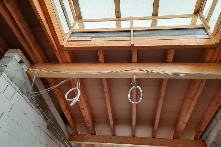 Im Innenbereich entfernten die Bauarbeiter die temporäre Abdichtung auf der Holzschalung der Decke über dem Erdgeschoss und starteten mit der Rohinstallation der Elektroleitungen.