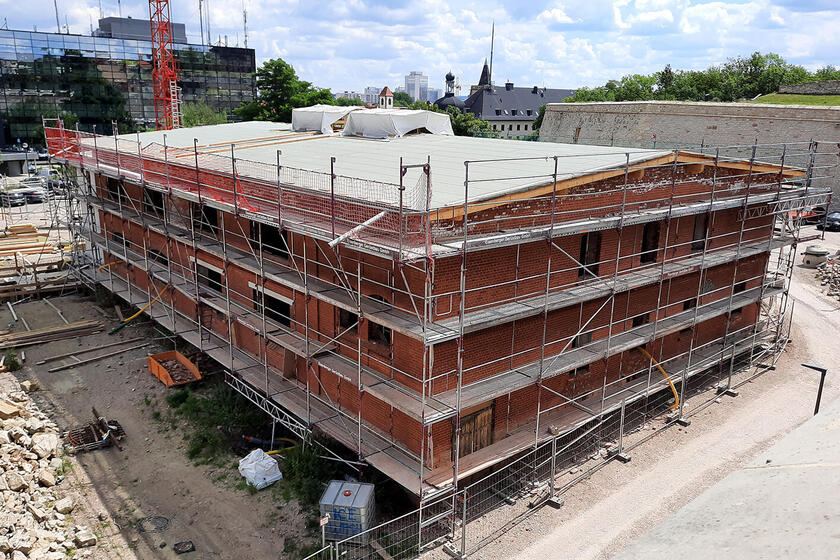 Die Bauarbeiten für die zukünftigen "Petersbergwichtel" schreiten weiter voran. An der Fassade wurden die Klinker ausgetauscht und die Rohinstallation der Elektroleitungen startete.