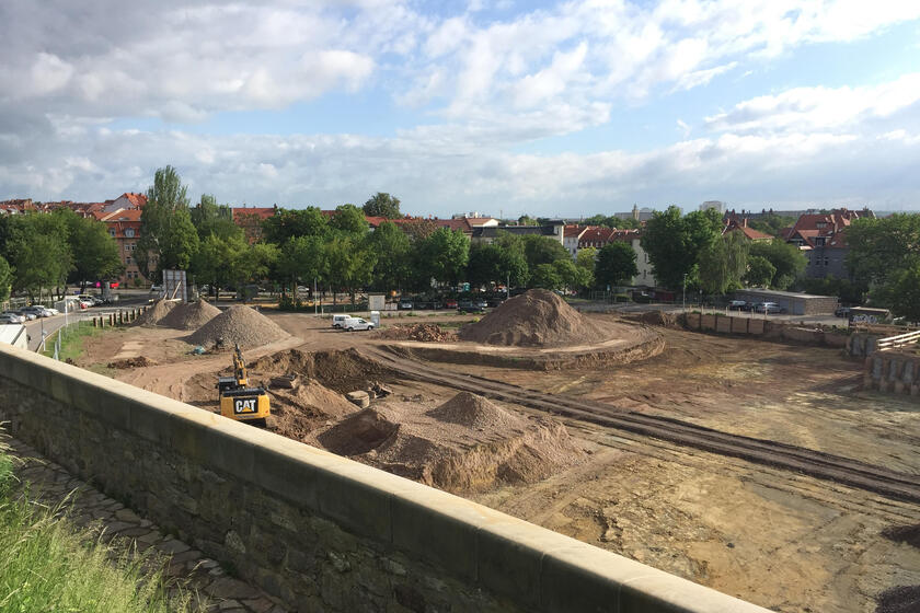 Die Dachabrissarbeiten für die Johanniter-Kita "Petersbergwichtel" sind abgeschlossen. Nun werden die Wände weiter auf die entsprechende Höhe hochgezogen, so dass das Dach anschließend draufgelegt werden kann.