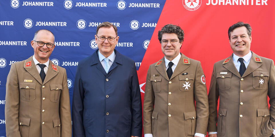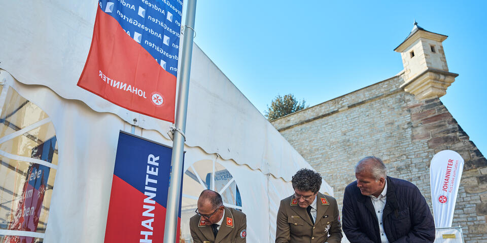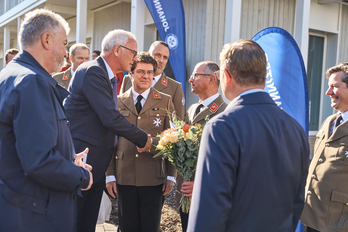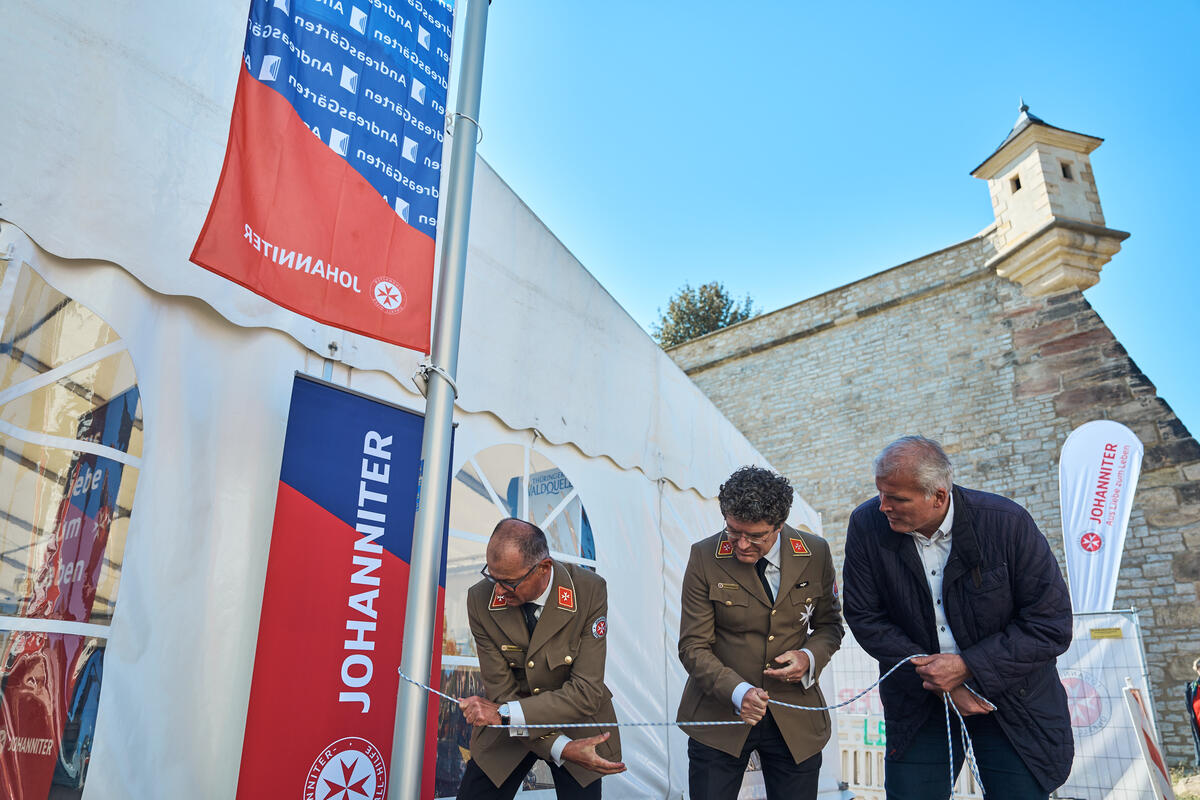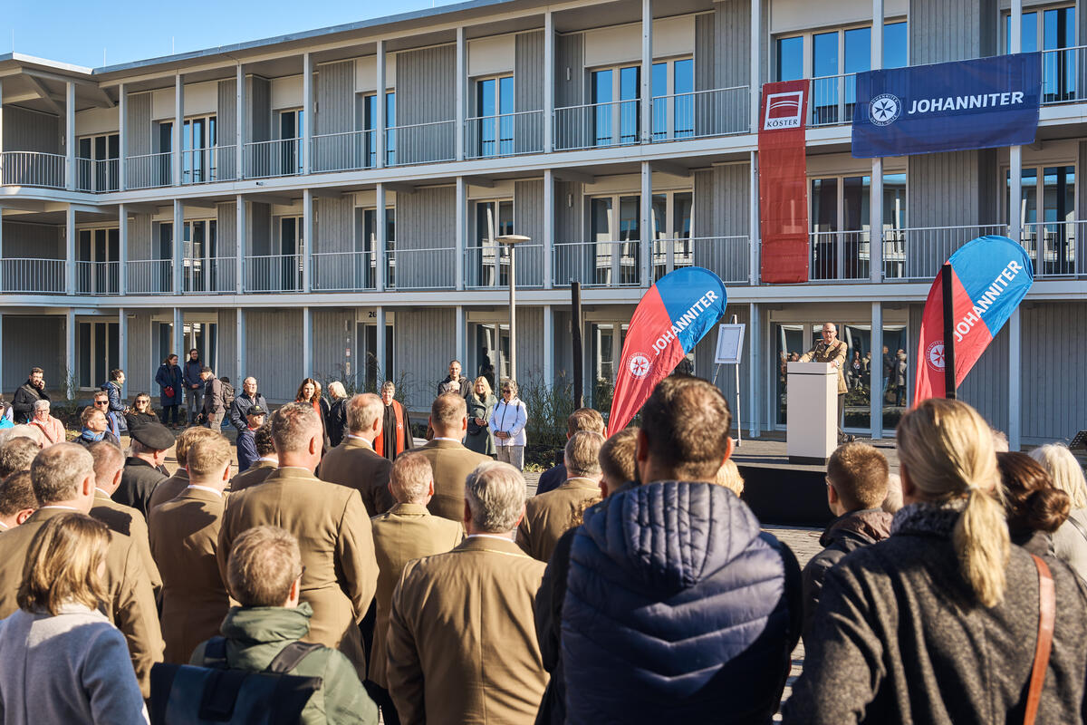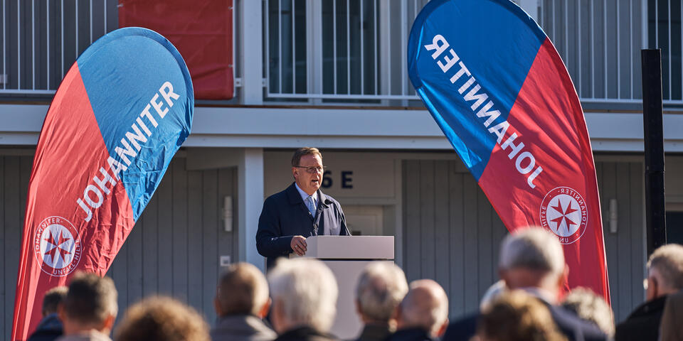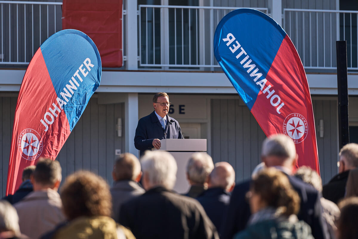 Landesvorstand Andreas Weigel begrüßte die Gäste aus Politik, Gesellschaft und der Johanniter-Welt im Innenhof des Wohnkomplexes und führte zugleich durch die Eröffnungsfeier. Ministerpräsident Bodo Ramelow, Oberbürgermeister Andreas Bausewein und Bundesvorstand der Johanniter-Unfall-Hilfe gehörten ebenso zu den Gastrednern wie der Geschäftsführer Ost von Köster GmbH für alle beteiligten (Bau)Firmen, ohne die dieses Projekt nicht realisierbar gewesen wäre.