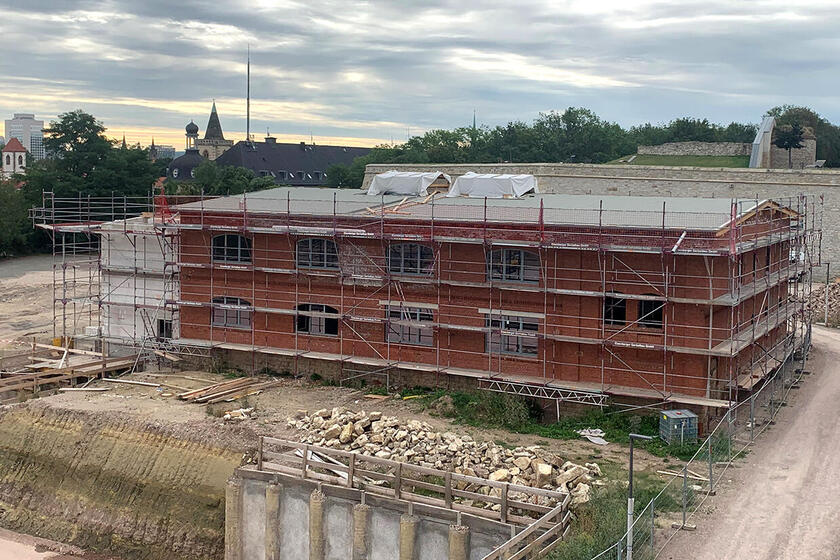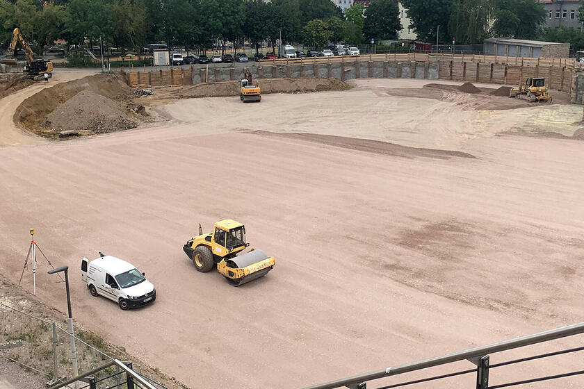 Der Bau der AndreasGärten geht auch bei sommerlich heißen Temperaturen weiter. Auf dem Areal der Wohnhäuser ist die Baugrube für den Baustart der Wohnungen hergerichtet.