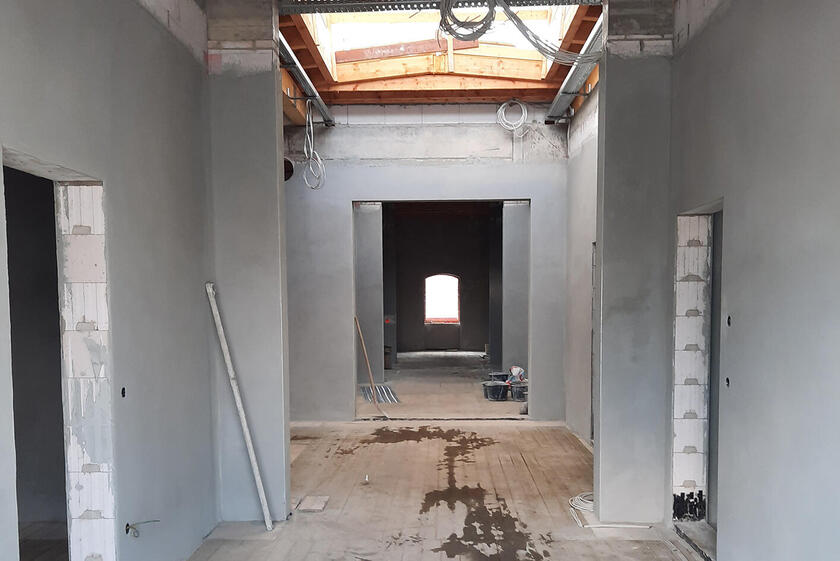 Im Kita-Gebäude sind die Fenster größtenteils eingebaut und die Brandschutzbekleidung der Holzbalkendecke fertig gestellt sowie die Putzarbeiten im Obergeschoss abgeschlossen.