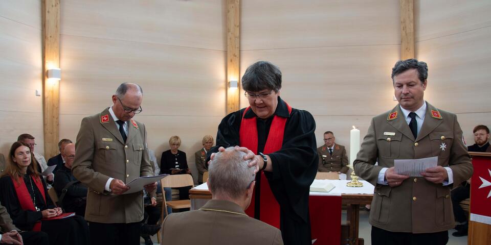 Nach der Schlüsselübergabe zogen die Protagonistinnen und Protagonisten und Gäste in die Kapelle ein und Landespfarrerin Anne-Christina Wegner übernahm die Weihung und Segnung. Im Anschluss konnte Carsten Wiedenfeld in der neuen Kapelle offiziell in das Amt als hauptamtlicher Regionalvorstand des Regionalverbandes Mittelthüringen eingeführt werden. Pfarrerin Wegner übernahm das traditionelle Zeremoniell gemeinsam mit Andreas Weigel und Konstantin von Eichborn, Mitglieder des Landesvorstandes.
