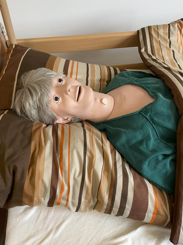 Herzstück des neuen Schulungsraums ist eine lebensechte Pflegepuppe, an der unterschiedlichste Pflegesituationen trainiert werden können. Sie erlaubt es, Wunden zu versorgen, Spritzen zu setzen, Katheter zu legen oder den Umgang mit Stomapatienten zu üben. Auch Lagerungs- und Verbandstechniken lassen sich realistisch nachvollziehen. So sammeln unsere angehenden Pflegefachkräfte Sicherheit und Routine, bevor sie Patientinnen und Patienten im Alltag betreuen.
