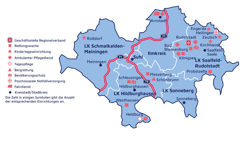 Im Johanniter-Regionalverband Südthüringen sind über 230 Mitarbeiterinnen und Mitarbeiter tätig. Mehr als 170 ehrenamtliche Aktive und unzählige Fördermitglieder unterstützen unsere Arbeit. Unser Verbandsgebiet umfasst die Landkreise Saalfeld-Rudolstadt, Hildburghausen, Schmalkalden-Meiningen, Sonneberg sowie den Ilmkreis und die kreisfreie Stadt Suhl.