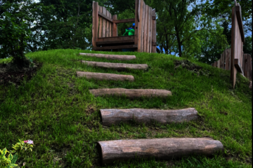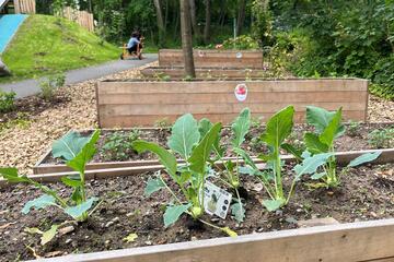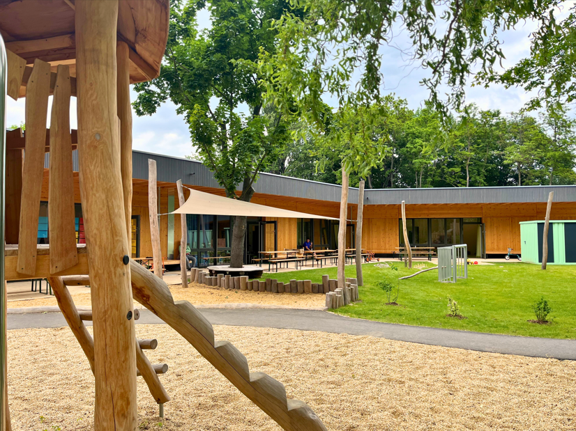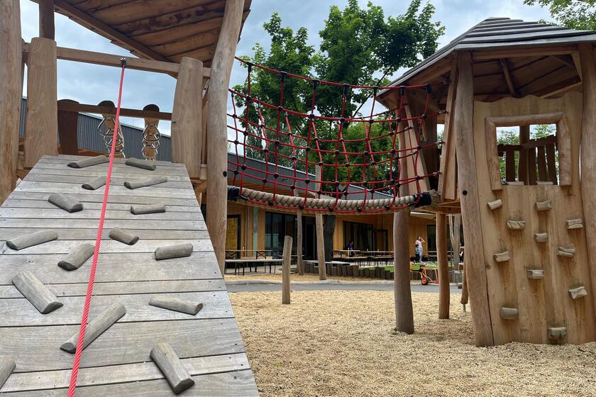 Alle Entdeckungsräume sind durch bodentiefe Fenster mit dem Garten verbunden. Dieser ist ebenfalls frei begehbar. Im freien Spiel können die Kinder toben, klettern, gärtnern, rennen und den Mini-Fuhrpark nutzen. Dafür gibt es sogar eine extra angelegte Rennstrecke. Die alten Bäume spenden Schatten.