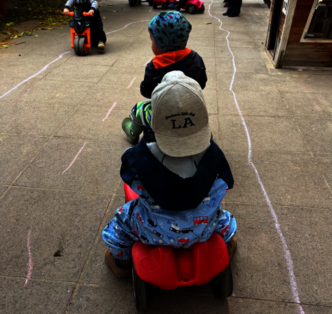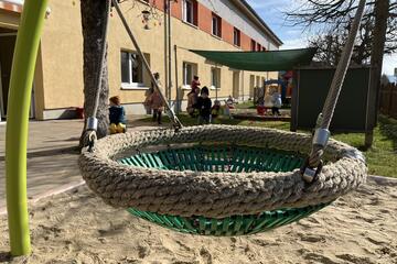 Direkt vom Krippenbereich ist unsere Terrasse mit vielfältigen Spielmöglichkeiten für die Kleinsten erreichbar. Ein Sandkasten lädt zum Buddeln und Bauen ein. Es kann geklettert, gerutscht oder in der Nestschaukel geschwungen werden. Besonders beliebt sind die Rutschfahrzeuge und ein kleines Hexenhäuschen zum Verstecken.