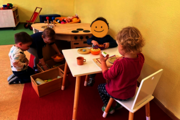 Weitere Themenräume, in denen teiloffen gespielt und entdeckt werden darf, sind das Atelier zum Malen, Basteln und Forschen. Der Bauraum gefüllt mit Bausteinen, Tieren und Fahrzeugen und der Rollenspielraum, in dem die Kinder in unzählige Rollen schlüpfen und sich ausprobieren dürfen.