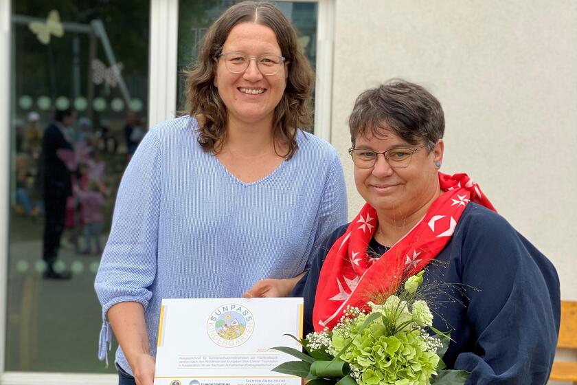 Unsere Kindertagesstätte „Sterntaler“ arbeitet seit 2019 mit Frau Dr. Noack vom Tumorzentrum Magdeburg an einem Projekt zum Thema Sonnenschutz. Der „Sun-Pass“ ist eine Kampagne der Europäischen Hautkrebsstiftung – in Sachsen-Anhalt wird diese umgesetzt durch die Krebsgesellschaft und lokale Botschafter. Es geht darum, Kinder und Eltern frühzeitig zu sensibilisieren, welche Auswirkung Sonne auf den Körper hat und welche Maßnahmen zum Schutz der Haut man ergreifen kann. Nun wurden alle Bedingungen für die Zertifizierung erfüllt und die Einrichtung erhielt feierlich ihr Zertifikat.