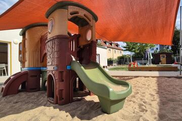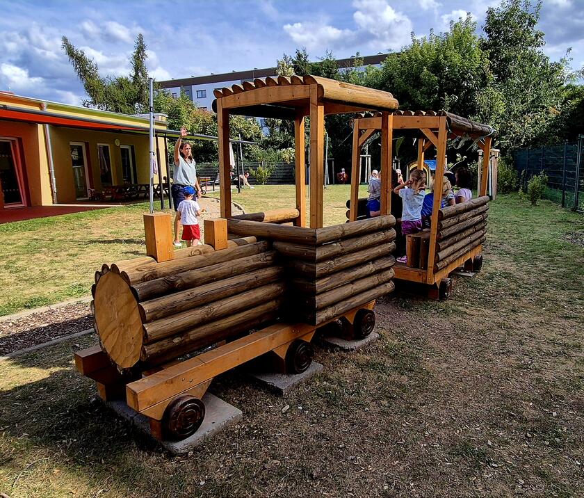 Der großzügige Garten der Kita bietet vielfältige Möglichkeiten zur Bewegung und zum Entdecken: ein Klettergerüst, zwei Schaukeln, Wipptiere sowie zahlreiche Rückzugs- und Spielbereiche. Ergänzt wird das Angebot durch regelmäßige Ausflüge in die Natur und zu nahegelegenen Spielplätzen, die den Kindern neue Eindrücke und Erfahrungen ermöglichen.