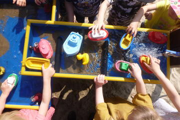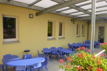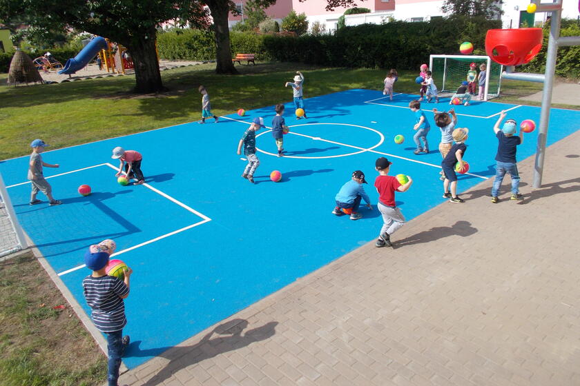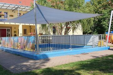 So gibt es Klettermöglichkeiten in verschiedenen Höhen, ein Trampolin oder Fahrzeuge (z.B. Dreiräder, Roller) in verschiedenen Größen sowie eine Kinderbaustelle. Wenn es die Temperaturen erlauben, steht den Kindern eine Matschanlage sowie unser großer Pool zur Verfügung.