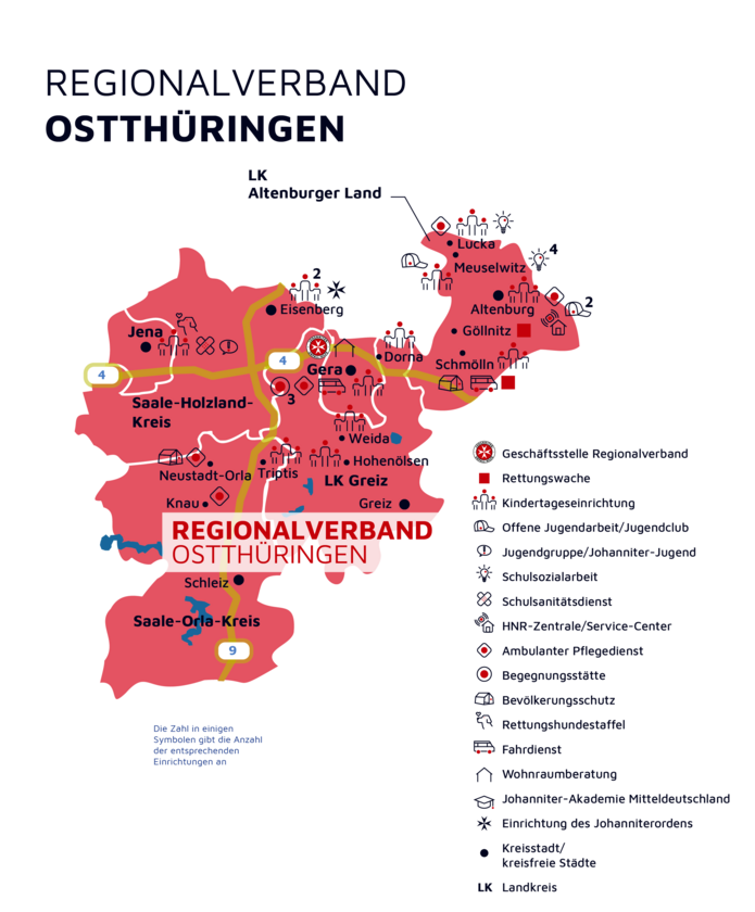 Der Regionalverband Ostthüringen wurde 1991 gegründet und ist seitdem eine feste Größe in der Region in den Bereichen Kinderbetreuung, Jugendarbeit, Rettungswesen, Fahrdienst, Pflege, Hausnotruf und Erste Hilfe. Das Gebiet des Verbandes erstreckt sich vom Altenburger Land über die Otto-Dix-Stadt Gera und das Umland, über den Greizer Landkreis mit Weida, weiter in den Saale-Orla-Kreis mit Neustadt, Pößneck und Triptis, über den gesamten Saale-Holzland-Kreis mit der Stadt Eisenberg bis zur Lichtstadt - Jena.