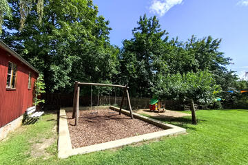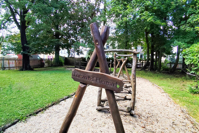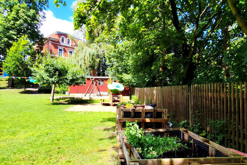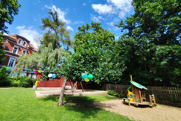 Die in einer schönen Gründerzeitvilla (erbaut 1893) liegende Einrichtung wurde in zwei Etappen komplett saniert, wobei die letzte Sanierung 2011 abgeschlossen wurde. Die Kita erstreckt sich über mehrere Etagen. Die Außenanlage der Kindertagesstätte unterteilt sich in einen Hof und ein großzügiges Außengelände. Der Hof bietet den Kindern unter alten Bäumen viel Platz zum Spielen und Toben und das „Leernaschen“ der Obstbäume ist in jedem Sommer eine große Freude. Das Außengelände mit der leichten Hanglage, wird zu jeder Jahreszeit gerne durch die Kinder genutzt, ob zum Schlittenfahren im Winter oder als Liege- und Spielwiese im Sommer. Auf dem Gelände hat noch ein Tarzan-Pfad, ein Klettergerüst mit Rutsche, großer Sandkasten, zwei Schaukeln und eine Nestschaukel Platz gefunden und bietet den Kindern reichlich Abwechslung.
