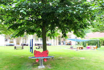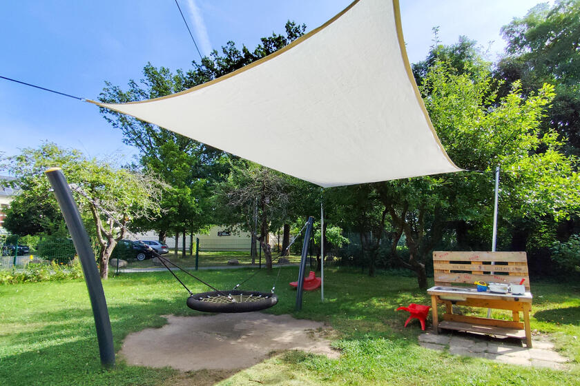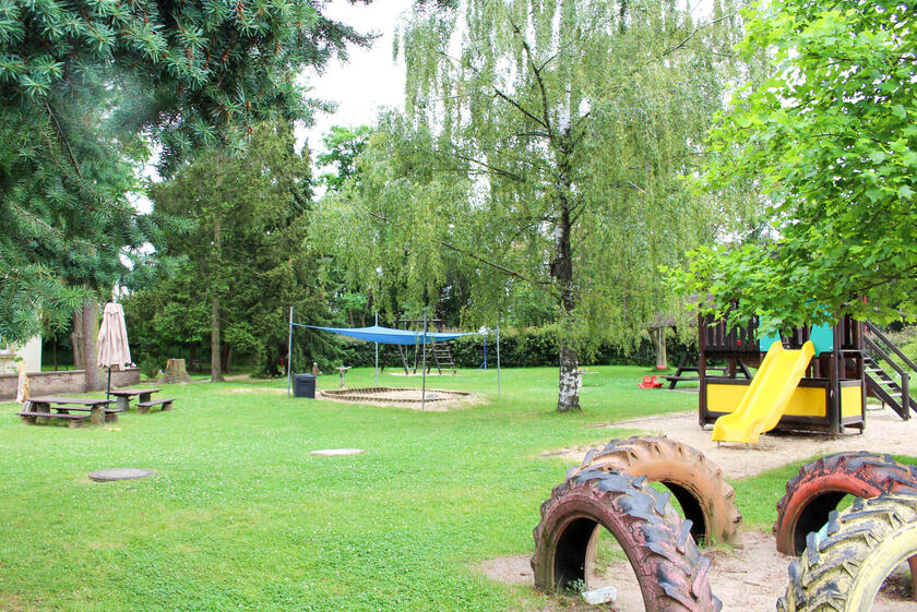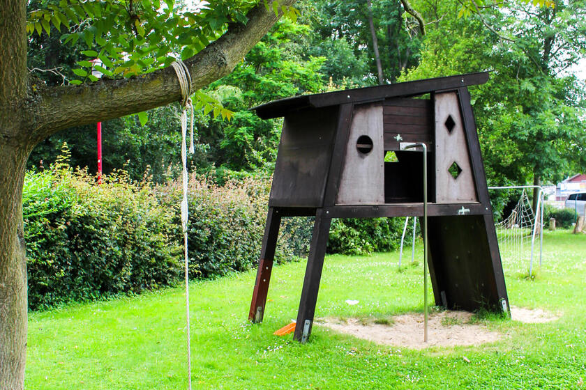In unserem Kindergarten kann Ihr Kind sich in einer ruhigen Umgebung zu einer eigenständigen Persönlichkeit entwickeln. Unser 6200 qm großes Außengelände bietet den Kindern zahlreiche Möglichkeiten zum Spielen, Toben und Verstecken, um die Natur ganz bewusst erleben zu können. Unsere Großen können im Baumhaus auf Entdeckungsreise gehen, im Sandkasten Matschstraßen bauen, im Klettergerüst spielen oder auch auf den verschiedenen Schaukeln sich ausprobieren. Für unsere Kleinsten gibt es einen separaten Außenbereich, welcher neben einem Klettergerüst, Rutschen, einem großen Sandkasten einer Wippe sowie einer Schaukel keine Kinderwünsche offenlässt.