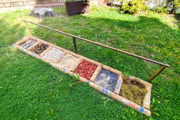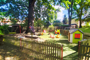 Der große Garten bietet verschiedene Spielgeräte und -bereiche:
