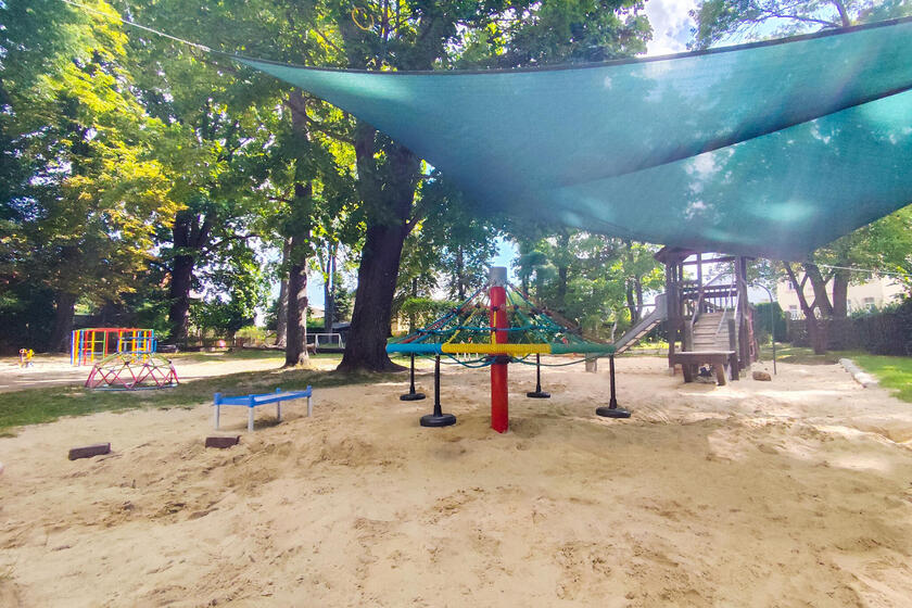 - EIne Sandlandschaft mit Klettergerüst, Spielküche, Karussell und Baggern
