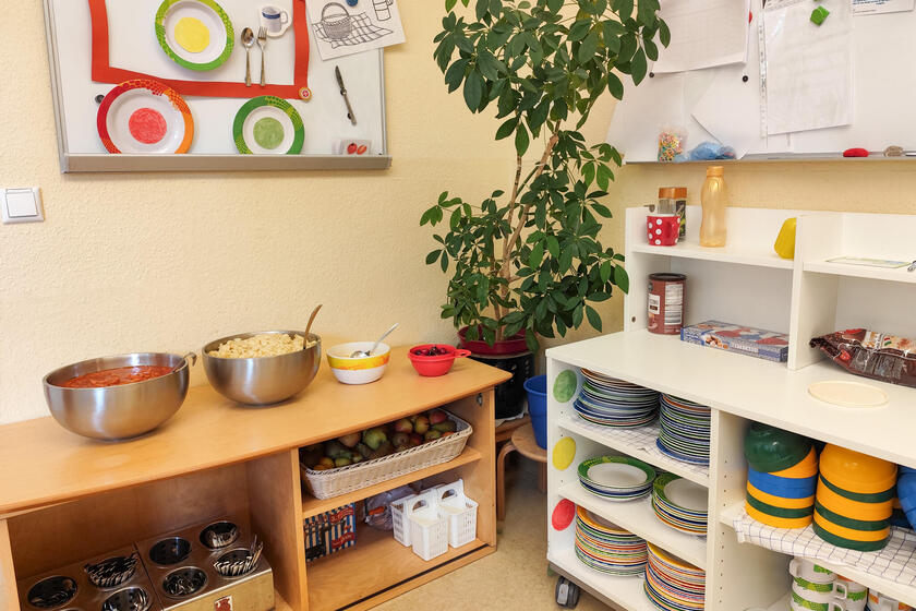 Gesunde Ernährung ist in aller Munde - in unserer Einrichtung auch wortwörtlich. Die Kinder lernen, welche Lebensmittel in welcher Menge gesund oder ungesund sind und genießen mit der täglich frischen Auswahl an Obst- und Gemüsesorten regionale und saisonale Angebote. Ergänzt werden die Mahlzeiten durch die Ernte aus unserem Kräutergarten (z.B. Tomaten, Himbeeren, Erdbeeren, Möhren, Radieschen). Das Naschen von Süßigkeiten ist erlaubt, findet aber nur zu besonderen Anlässen wie Geburtstagen und Festlichkeiten statt.