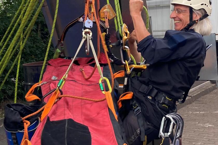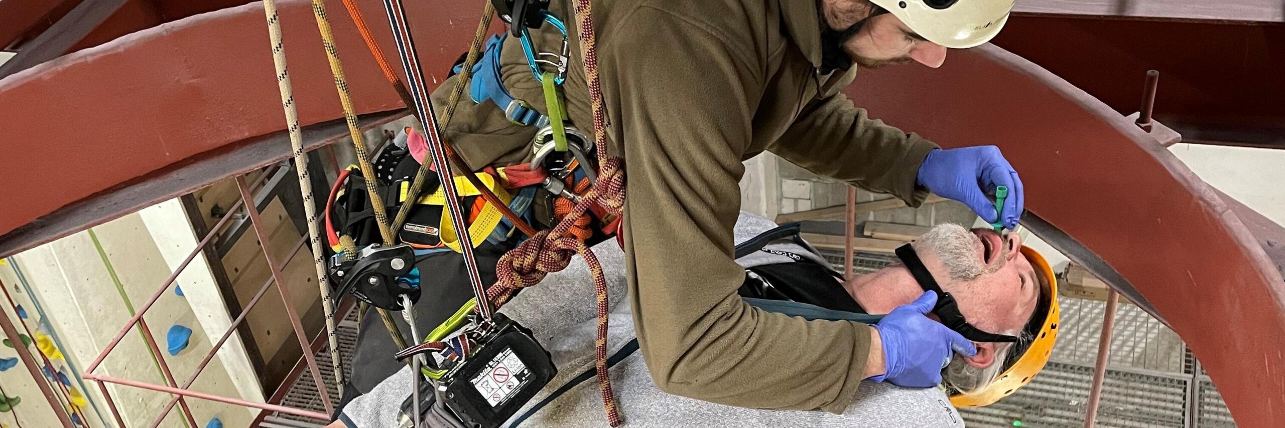 Unsere Lehrgänge bieten eine deutlich erweiterte Erste Hilfe in Theorie und ausgiebiger Praxisarbeit, mit speziellem Material unter schwierigen Einsatzbedingungen. Ihre Mitarbeitenden lernen beispielsweise das Legen eines Wendl-Tubus bei einem bewusstlosen Patienten im Seil.
