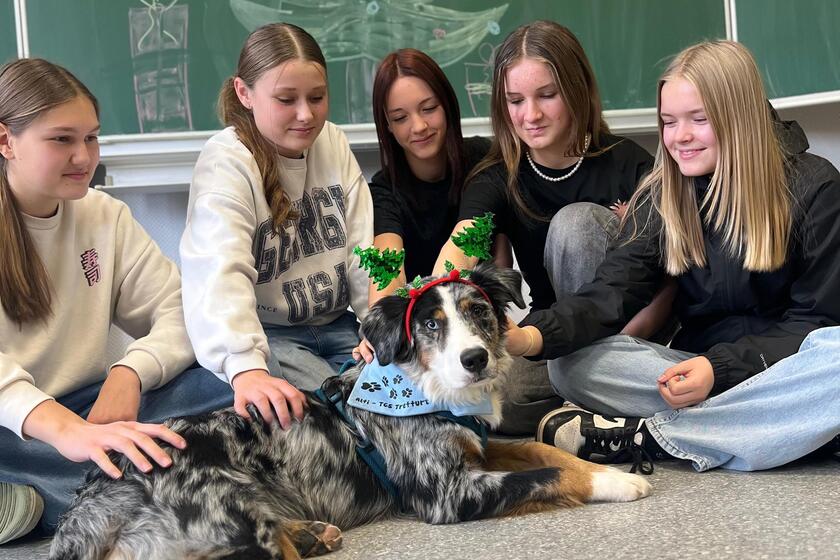 Damit Alfi entspannt bleibt, verbringt er viel Zeit in seiner gemütlichen Ruheecke im Büro – schließlich ist viel Ruhe genauso wichtig wie neue Eindrücke. Die Schüler und Lehrer sind begeistert von unserem tierischen Teammitglied und freuen sich jedes Mal, wenn er da ist.