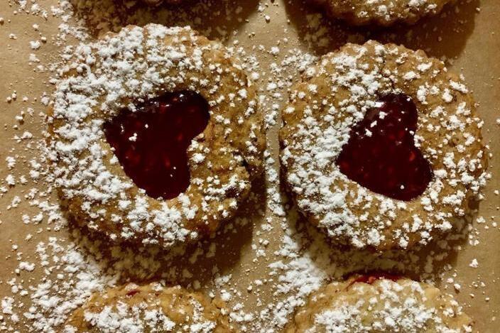 Plätzchen mit Johannisbeergelee bestreichen und die Oberseite (die mit dem ausgestochenen Motiv) aufsetzen und leicht andrücken. Mit etwas Puderzucker „beschneien“.