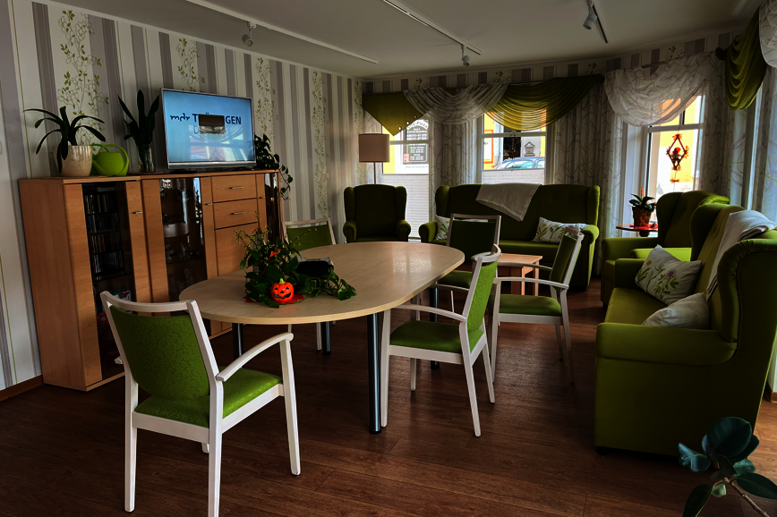 Die zentral am Marktplatz gelegene Senioren-WG bietet barrierefreie Ein- und Zwei-Raum-Apartments für bis zu zwölf Bewohnerinnen und Bewohner, jeweils mit eigenem Bad. Die Wohnungen können individuell eingerichtet werden und ermöglichen ein selbstständiges Leben in den eigenen vier Wänden. Gleichzeitig wird großer Wert auf Gemeinschaft gelegt: Alle Mahlzeiten werden gestellt und gemeinsam eingenommen. Ergänzt wird das Angebot durch regelmäßige Beschäftigungsangebote wie gemeinsames Backen, Gesellschaftsspiele oder Ausflüge. Je nach Bedarf können zudem ambulante Pflegeleistungen sowie der Johanniter-Hausnotruf in Anspruch genommen werden.