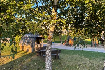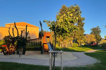 Für die Kleinsten (Krippengarten): Vogelnestschaukel, Weidenhäuschen, Hangrutsche, Sprunggrube, zwei Sandkästen sowie Fahrzeuge und Sandspielzeug.