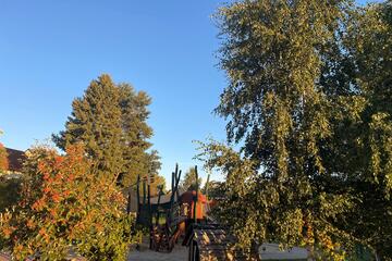 Direkt an die Kita grenzt ein großes, weitläufiges Gartengelände, das viel Bewegungsfreiheit und Abenteuer bietet.