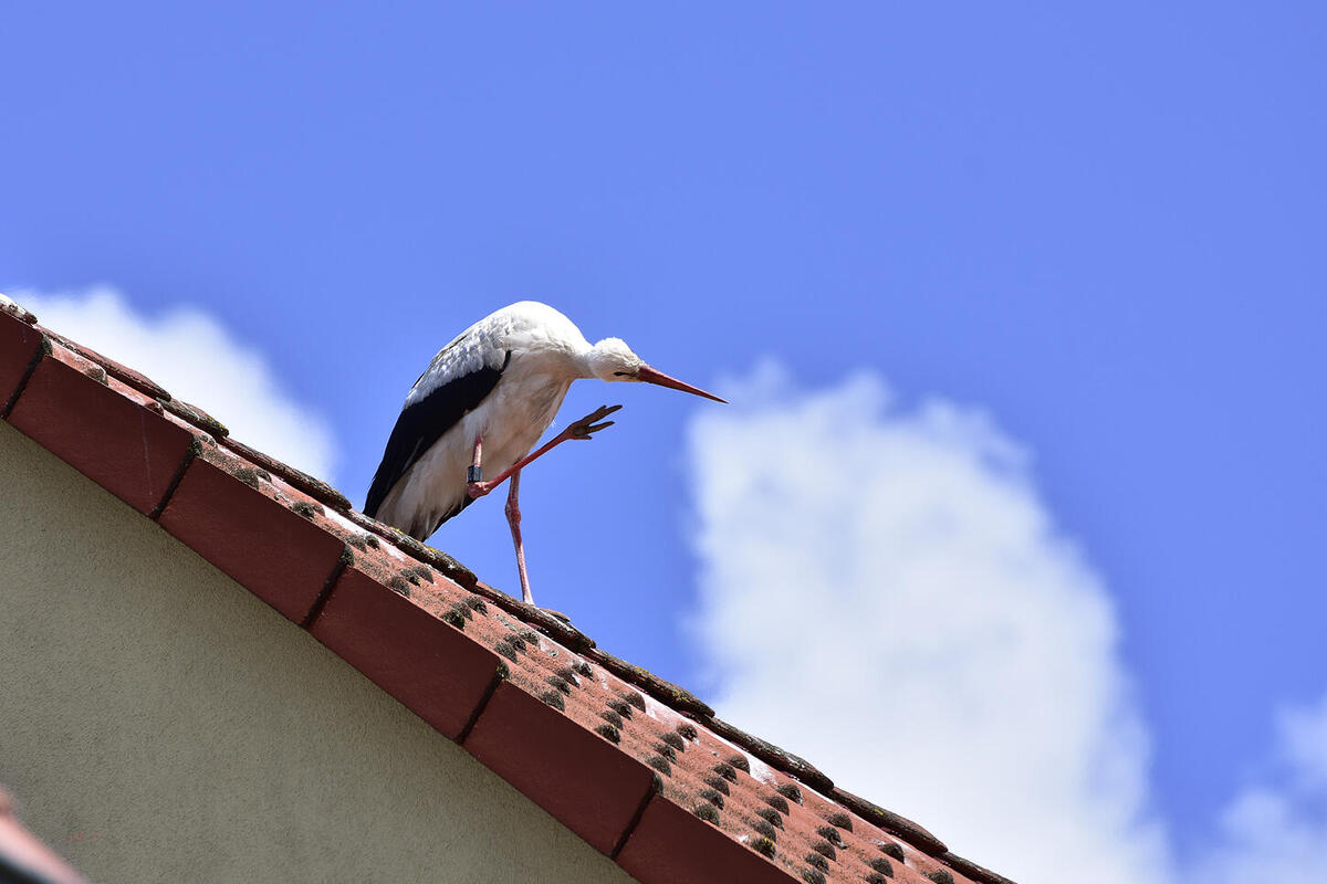 2023 war die Ankunft erst am 1. April und 2022 gar erst am 10. April. Diesmal war Elfriede zuerst am Nest. Mit viel Geklapper wurde sich begrüßt und sofort Hochzeit gefeiert. Fleißig wurde am Nest gebaut und die vielen Aufstiege von Erich 2 hatten Erfolg. Am 4. April lag das erste Ei im Nest, das zweite am 6. April, und aller zwei Tage weitere zwei, so dass am 12. April fünf Eier im Nest lagen. Das war schon eine gute Quote. Am 8. Mai schlüpfte das erste Küken und im Tagestakt (was schon ungewöhnlich ist) schlüpfte das Vierte am 11. Mai. Das Fünfte kam erst am 13. Mai und schon da war zu erkennen, dass es nur einen Tag leben sollte. Die vier Jungen waren somit nur drei Tage auseinander und sollten damit gleiche Überlebenschancen haben. Aber weit gefehlt. Als ob die Altstörche das Wetter vorher gesehen haben mit Trockenheit und Hitze und somit kein Futter für die Jungstörche, wurde Küken Nr. 4 am 14. Mai und Küken Nr. 3 am 24. Mai “nachhaltig verwertet”. Das sah ziemlich grausam aus, ist aber der Natur geschuldet und war die richtige Entscheidung, denn die beiden verbliebenen Jungstörche hatten somit gute Überlebenschancen.