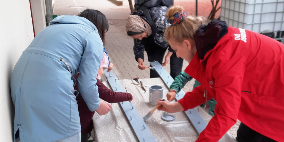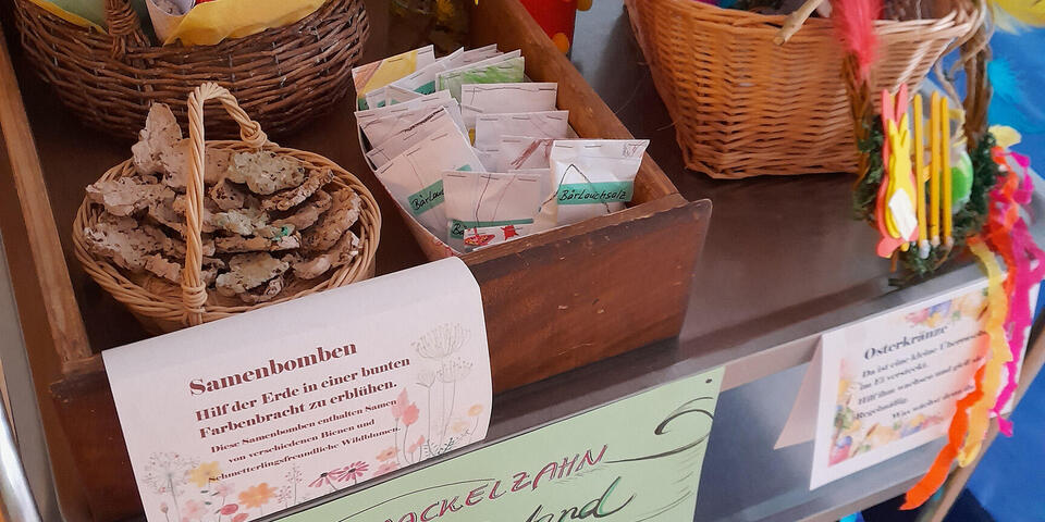 Am Nachmittag konnten wir gemeinsam mit den Eltern unseren Garten wieder auf Vordermann bringen. Dazu wurden mitgebrachte Frühlingsblüher eingepflanzt, die Kräuterschnecke von Unkraut befreit, unsere Außengarderobe gestrichen und wir haben den Sichtschutz erneuert. Dazu haben unsere Wackelzahneltern und Wackelzähne (Vorschüler) einen Kuchenbasar begleitet. Es gab auch einen kleinen nachhaltigen Verkaufsstand der Wackelzähne mit selbstgemachten Dingen, wie Bärlauchsalz, Samenbomben und Osterkränzen. Mit den gesammelten Spenden können wir ihnen nun erstmalig T-Shirts zum Abschied finanzieren. Alles in allem ein sehr ereignisreicher und gelungener Tag, auf den wir mit viel Dankbarkeit zurückblicken!
