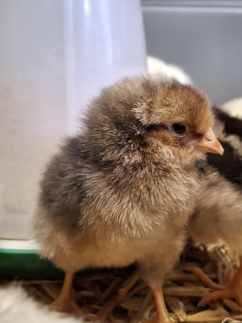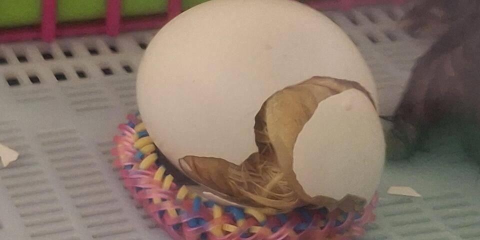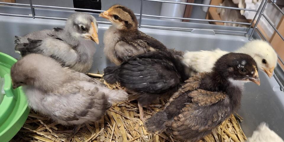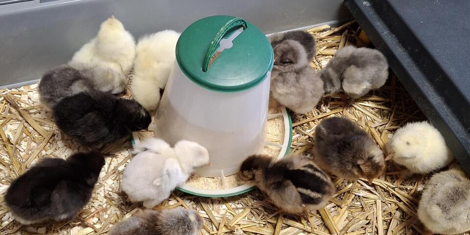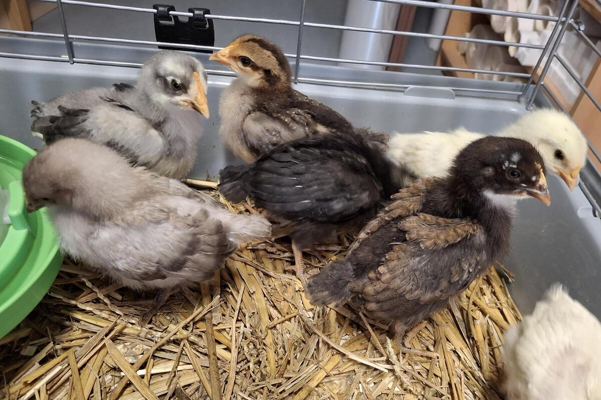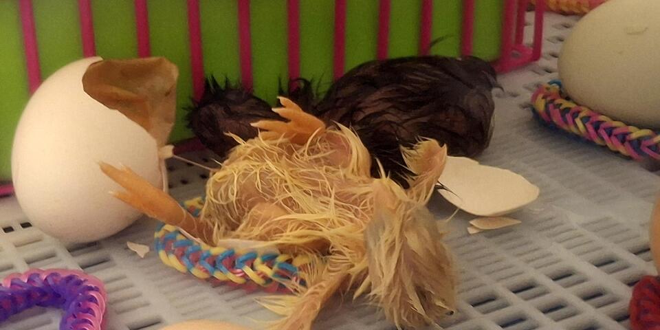 Nach genau 21 Tagen Brutzeit war es dann so weit: Vier kleine Küken erblickten das Licht der Welt. Anfangs noch nass und unbeholfen dauerte es nicht lange, bis sie getrocknet waren und schon munter umherliefen. Die nächsten Eier wackelten und wir konnten genau erkennen, wie die Küken von innen Löcher in die Schale pickten, die Schale zersprang und die Küken eines nach dem anderen schlüpften. Nachdem alle getrocknet waren, zogen sie in einen großen Käfig mit einer Unterlage aus Heu, Sägespänen und einem Futter- und Wasserautomaten um.