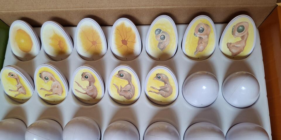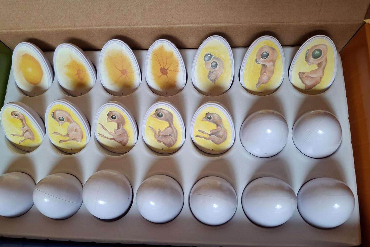 Familie Sammler hatte uns einen Anschauungskasten mit 21 Modelleiern mitgegeben. Hier konnte man genau erkennen, in welchen Entwicklungsstadium sich die Küken befinden.