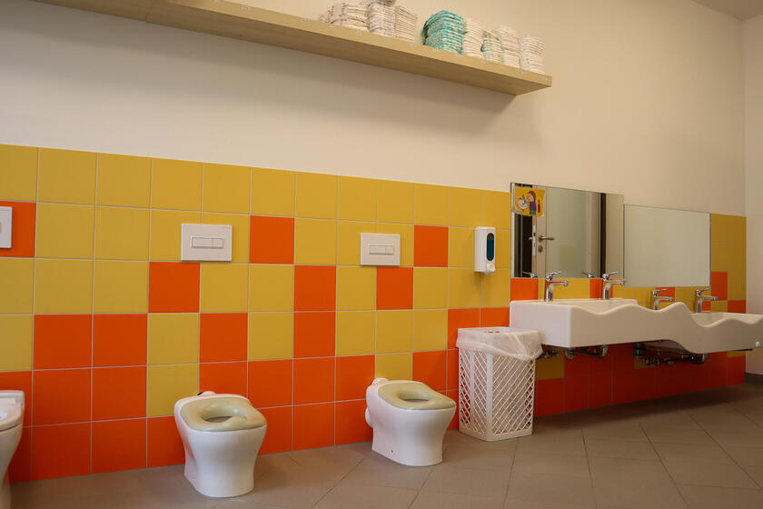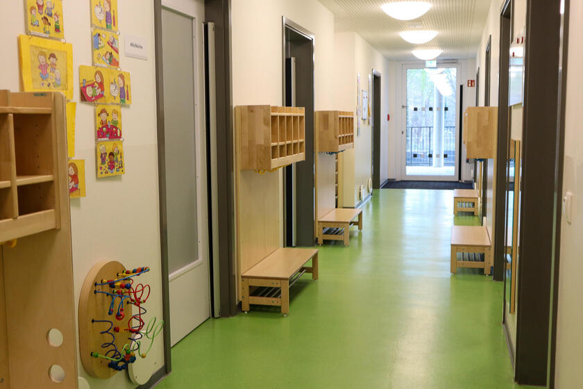 Zum Bestandshaus eröffnete im Februar 2022 auf selbigem Gelände ein Krippenbau. Auf drei Etagen sind die Kinder in der Kernzeit festen Gruppen zugeordnet. Ein Miteinander auf der Etage ist durch nebeneinanderliegende Räume jedoch jederzeit möglich und wird vor allem in den Randzeiten genutzt.