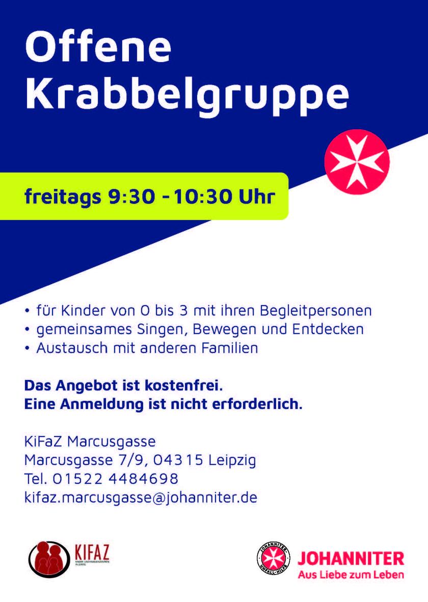 Kinder von 0 bis 3 Jahren und ihre Begleitpersonen sind ganz herzlich jeden Freitag von 9:30 bis 10:30 Uhr in unserem Familienzentrum Marcusgasse (Leipzig-Neuschönefeld) zum gemeinsamen Singen, Spielen, Bewegen und Entdecken eingeladen. Das Angebot ist kostenlosund kann ohne vorherige Anmeldung wahrgenommen werden.