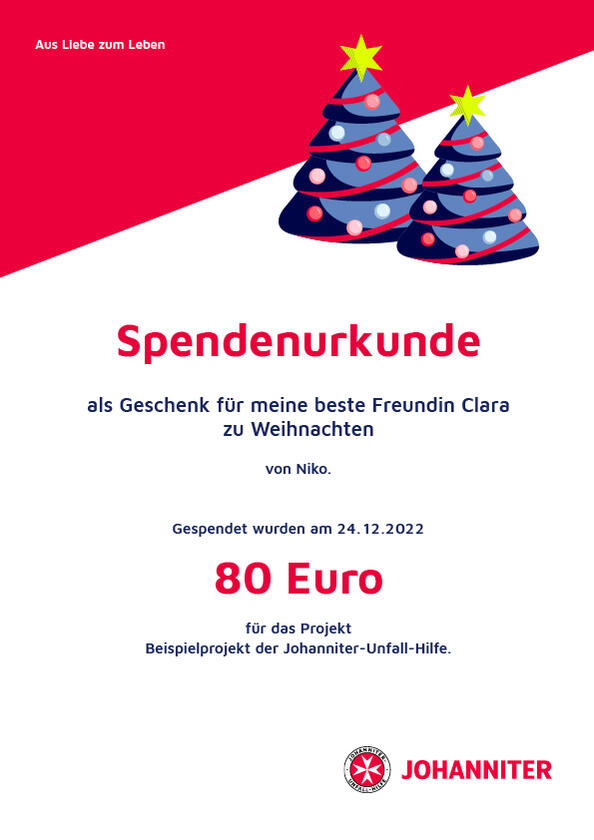 Im Anschluss erhalten Sie automatisch unsere Spendenurkunde. Die Urkunde senden wir Ihnen als PDF zu und stellen Sie zum Download auf der Dankseite bereit. Diese können Sie dann an Ihre Familie, Freundinnen und Freunde verschenken. Viel Spaß beim Schenken!