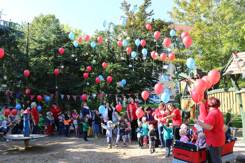 Und so hatte das Team der Kita für die Kids ein tolles Fest mit Luftballonaktion, Popkorn-Maschine, Slackline, Kreativstrecke u.v.m. organisiert. Die Kinder hatten sichtlich Freude an diesem Tag und sogar der Oberbürgermeister gratulierte und brachte ein paar Überraschungen mit.