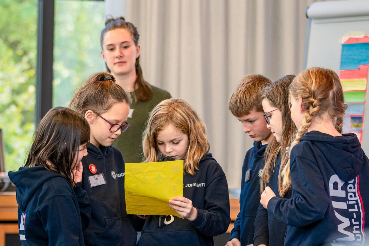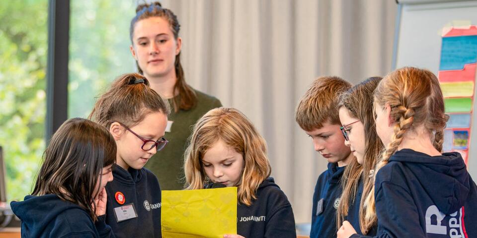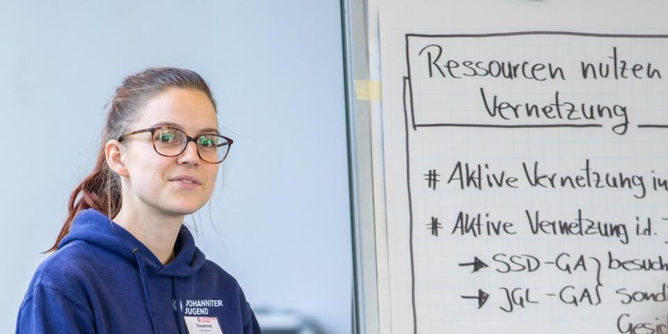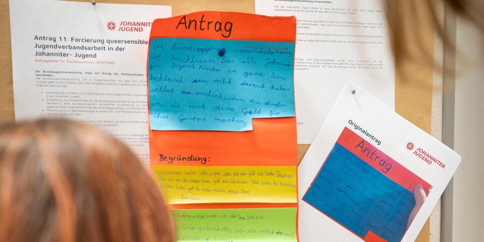 Nach der Mittagspause begrüßte die Versammlung ganz besondere Gäste, die bewiesen haben, dass schon unsere Jüngsten wissen, wie sie sich für ihre Bedürfnisse einsetzen können! Die sechs Kinder eines Schulsanitätsdienstes aus Hattingen, NRW, stellten dem höchsten beschlussfassenden Gremium der Johanniter-Jugend ihren Basisantrag vor. Vorher haben die sechs- und siebenjährigen fleißig über 50 Unterschriften gesammelt, um ihren Antrag auf Bundesebene einbringen zu können. Dass Mitbestimmung wichtig ist, haben die Kinder schon früh gelernt und wissen dies schon in ihrem jungen Alter perfekt umzusetzen! Da staunten die gewählten Vertreter*innen der Bundes- und Landesebene nicht schlecht. Mit ihrem Antrag wollen die Kinder mehr Mitbestimmung bei der Verteilung und Verwendung von finanziellen Mitteln an der Basis erreichen. Ihre Erfahrungen vom letzten Bundeswettkampf hat sie dazu bewegt den Antrag zu stellen: "Wir fanden es cool, dass wir selber entscheiden durften, was wir mit dem Preisgeld machen. Das hat voll gut geklappt.", berichteten sie. Die Kinder, die als C-Mannschaft, den Bundeswettkampf für sich entschieden haben und den ersten Platz belegten, haben ihr Preisgeld nach gemeinsamer Entscheidung gespendet. Sie stimmten ab und die 750€ wurden gemeinsam aufgeteilt für Projekte in Afrika, für arme Kinder in Deutschland und das örtliche Tierheim gespendet. Und wäre das nicht schon genug, haben die sechs selbstsicher den Großen erklärt, welche Idee sie haben, um Umweltverschmutzung zu reduzieren, armen Menschen zu helfen und diese Welt zu verbessern. Auch bereicherten die jungen "JJ-ler*innen" mit ihren Fragen die Versammlung: "Was ist eigentlich !ACHTUNG?", "Was sind Menstruationsprodukte?" oder "Sag mal, Max deinen Punkt habe ich noch nicht verstanden." Im ersten Moment vielleicht kindlich wirkend, brachten sie so ganz neue Perspektiven in die Versammlung ein und brachten die ein oder andere redeerfahrene Person an ihre Erklärungsgrenzen. Lehrerin und Jugendgruppenleiterin Mariella von der Burg war voller Stolz auf ihre Kids.