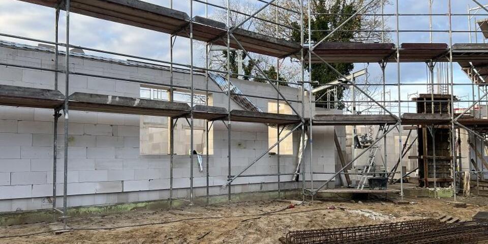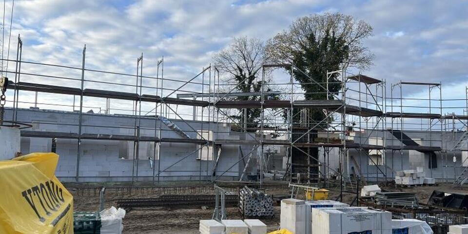 Seit dem Baubeginn Mitte Oktober hat sich viel getan: Das Fledermausquartier, welches später funktional auch als Geräteschuppen genutzt wird, ist derweil fertig und auch das Erdgeschoss des Kita-Neubaus steht kurz vor dem Abschluss. Nach Fertigstellung, die für Ende 2024 geplant ist, befindet sich auf dem Gelände ein zweigeschossiges modernes Gebäude mit Platz für 88 Kinder. Die vier großzügigen Gruppenräume und der zentrale Bewegungsraum werden hell und farbenfroh gestaltet und auch die Außenanlage wird Platz zum Spielen und Toben bieten.