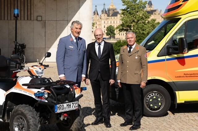 Georg Khevenhüller, Präsident des Malteser Hilfsdienstes, sagte, dass Bevölkerungsschutz Aufgabe der Hilfsorganisationen aber auch jedes Einzelnen sei: „Wir Johanniter und Malteser sind Hilfsorganisationen, die aus der Sorge um die Ausbildung in Erster Hilfe und den Bevölkerungsschutz gegründet wurden und in Notsituationen und Katastrophenfällen Hilfe leisten. Aber wir müssen uns noch besser auf mögliche Krisenszenarien vorbereiten. Dies ist nicht nur eine Frage für den Katastrophen- und Zivilschutz, sondern für die Bevölkerung des Landes Mecklenburg-Vorpommern, für jede Bürgerin und jeden Bürger des Landes.“ Beim Fototermin vor der IHK Schwerin zeigten ehrenamtliche Einsatzkräfte Einsatzfahrzeuge und packten symbolisch eine „Tasche für den Notfall“, um die Bedeutung persönlicher Vorsorge sichtbar zu machen.