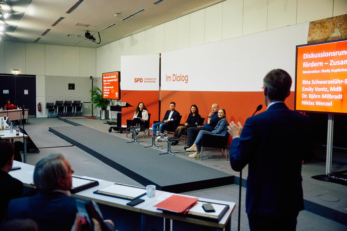 Was sind Herausforderungen in der Demokratie? Wie kann man junge Menschen fördern? Wie kann man demokratiefeindlichen Menschen entgegentreten? All dies waren Fragen, die unter Moderation von Shelly Kupferberg diskutiert wurden. Auf dem Podium: Rita Schwarzelühr-Sutter (MdB, Parlamentarische Staatssekretärin bei der Bundesministerin des Innern und für Heimat), Emily Vontz (jüngste Abgeordnete im Deutschen Bundestag und Vorsitzende der Jusos Saar), Dr. Björn Milbradt (Fachgruppenleiter „Politische Sozialisation und Demokratieförderung“, Deutsches Jugendinstitut e.V.) und Niklas Wenzel (Student und unter @otto.wels Influencer auf Instagram). Auch die anwesenden Gäste hatten die Möglichkeit zum Thema "Demokratie fördern – Zusammenhalt stärken" mit in die Diskussion einzusteigen.