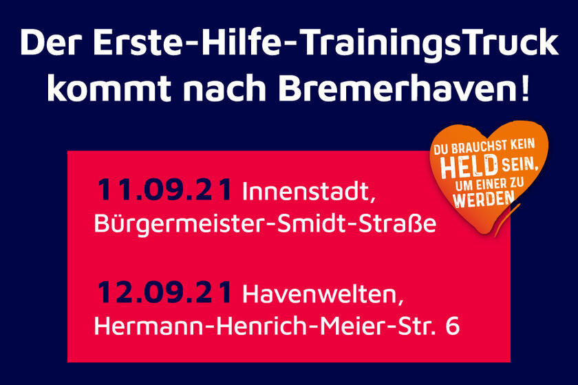 Um das Wissen rund um die Erste Hilfe spielerisch aufzufrischen und direkt zu trainieren, finden Interessierte den Erste-Hilfe-TrainingsTruck am 11./12. und 15./16. September in Bremerhaven bzw. Bremen