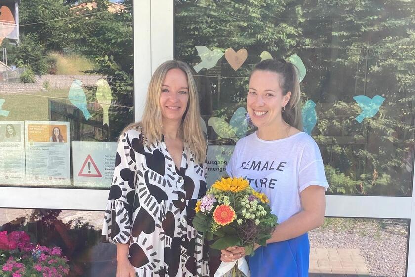 Kneiting ■ Das künftige Johanniter-Kinderhaus Kneiting begrüßt seine erste Leitung, Svenja Grunow. Zu diesem besonderen Anlass ist die Assistenz der Sachgebietsleitung der Johanniter Kindereinrichtungen, Regine Rusin, vorbeigekommen um Svenja Grunow zu willkommen zu heißen. Hierzu überreicht sie ihr einen großen Blumenstrauß.