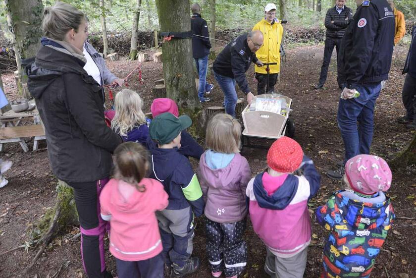 „Das ist großes Kino, wie das hier funktioniert hat“, stellt auch Wilfried Barysch fest, Mitglied im Vorstand des Regionalverbands Weser-Ems. „So schnell und unkompliziert geht das selten.“ Da war die Gestaltung des Geschenks schon deutlich komplizierter. Barysch und sein Vorstandskollege Thomas Lemke hatten einen prall gefüllten Bollerwagen dabei mit vielen nützlichen und spannenden Sachen. „Da haben sich unsere Damen im Sekretariat und in der Pressestelle riesige Mühe gegeben“, sagt Barysch. Nur Thomas Lemke hat ein Problem: „Schade, dass ich meinem Enkel nie von diesem tollen Waldkindergarten erzählen darf. Dann will er nicht mehr in seine Kita. Aber eine Wald-Kita gibt es dort nicht, wo er wohnt.“ Denn Wiesbaden ist nicht Wittmund.
