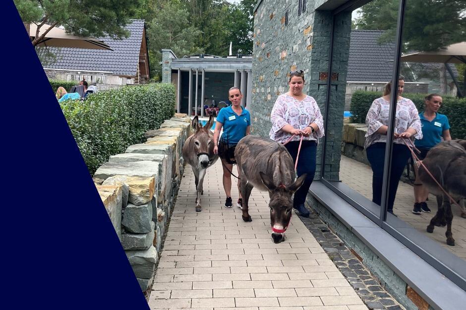 Fernab vom Klinikalltag besuchten Elvira und Benjamin, die beiden Esel der Kinderfachklinik Bad Sassendorf, Mitte August die Börde Therme.