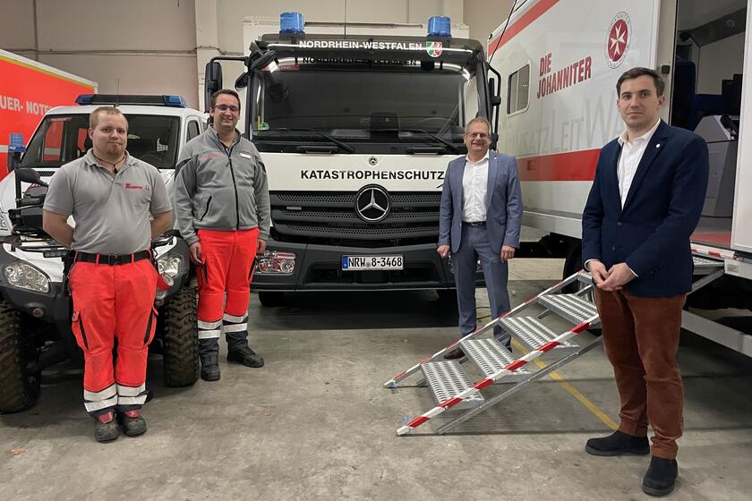 Köln/Düsseldorf Der Landtagsabgeordnete Thomas Schnelle (CDU) hat am 8. November gemeinsam mit Fraktionsreferentin Tijen Ataoğlu die Düsseldorfer Johanniter besucht, um sich mit deren Experten über die aktuellen und künftigen Herausforderungen im Katastrophenschutz auszutauschen. Dieser war durch das große Engagement in der Corona-Pandemie, bei der Hochwasser-Katastrophe 2021 und zuletzt bei der Betreuung von geflüchteten Menschen aus der Ukraine stark in den öffentlichen Fokus gekommen. Johanniter-Regionalvorstand Marvin Adels stellte dem Beauftragten für die Feuerwehr, Katastrophenschutz und Hilfsorganisationen der NRW-CDU die Düsseldorfer Fahrzeuge aus der UNIversellen Katastrophenschutz-Einheit (UNIKE) der Johanniter NRW vor. Die geländegängigen Spezialfahrzeuge wie beispielsweise ein Unimog-Rettungswagen ermöglichen es den Johannitern, auch in überschwemmten oder zerstörten Gebieten zu verletzten Menschen zu gelangen.