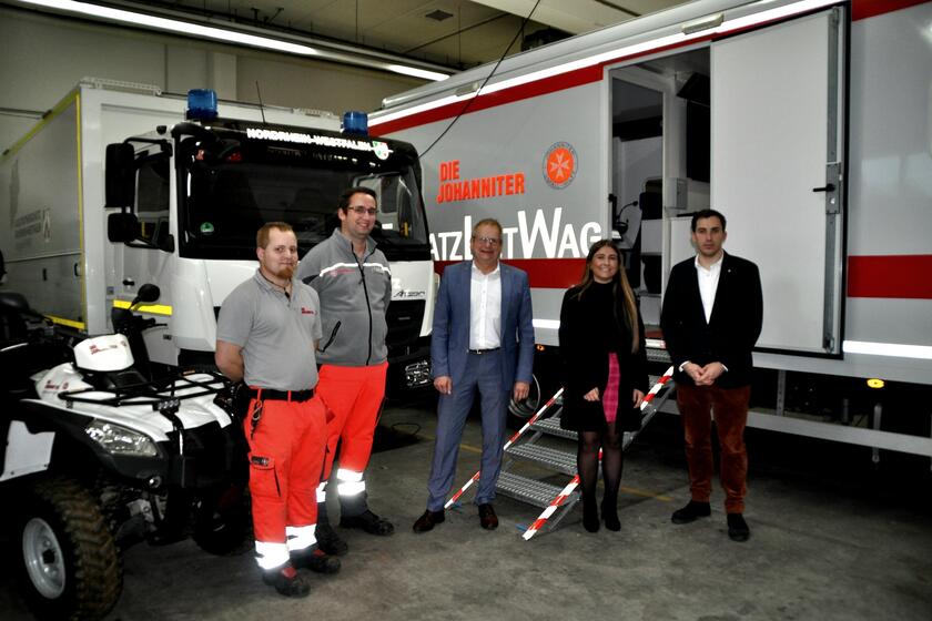 Die ehrenamtlichen Katastrophenschützer Timo Clames und Tim Saemisch zeigten die geländegängigen Einsatzquads und den Einsatzleitwagen der Johanniter im Regionalverband Rhein-Ruhr, aus dem große Einsätze geführt werden. „Die Johanniter haben vorbildlich früh und viel in einen modernen, autarken Katastrophenschutz investiert. Wir haben bei der Hochwasser-Katastrophe erlebt, wie wichtig